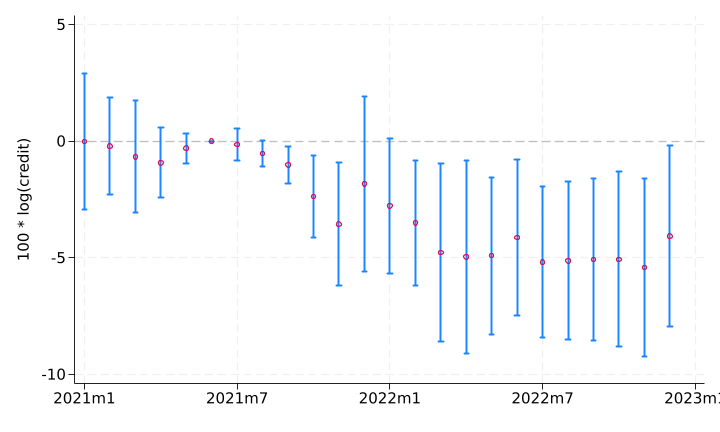 The picture shows the response of firm-bank credit during the 2021 inflation surge, keeping credit demand constant, for a one-standard-deviation more maturity-exposed bank.