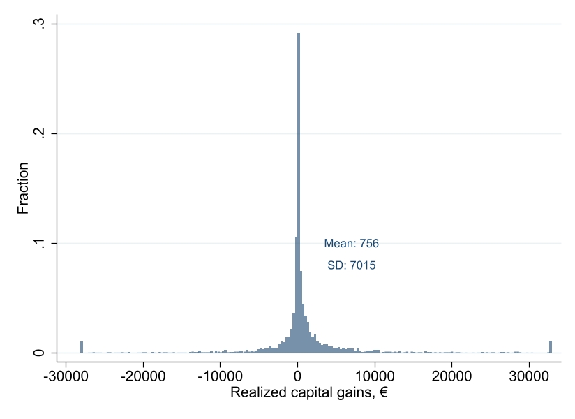 The picture shows the distribution of realized capital gains on stocks traded by households in the Dutch Household Survey, 2001-2023, based on our re-constructed history of trades in the panel.